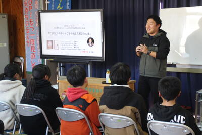 講演には、本校5・6年生、保護者、教職員、地域の方が参加しました。
