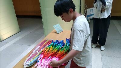 口のまわりの筋肉をつかって風船を膨らませるのにチャレンジ!見事に大きな風船ができました。