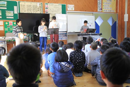 5年生が「威風堂々」の合奏と「ビリーブ」の合唱を発表しました。