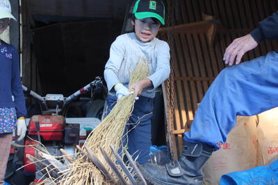 くまモンと一緒に刈った稲ということで、子供たち密かにくまモンが来ることを期待しながら昔の道具を使い脱穀しました。また、手でなう縄ないだけでなく、機械を使った縄ないも体験し、たくさんの学びがあった活動となりました。