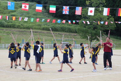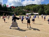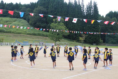 最後は、全校ダンス! 今年、町内の中学生と5・6年生が出かけた「大阪・関西万博研修」にちなんで、万博のテーマ曲で踊りました。子供たちがかけているサングラスの真ん中には万博マスコットの「ミャクミャク」が。(校長先生手作りの作品です!)