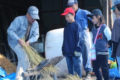 10月18日(水)に3・4年生の子供が、地域の方に教えてもらいながら脱穀と縄ないをしました!