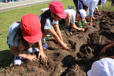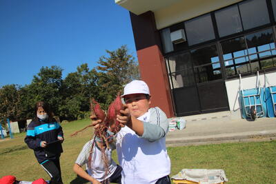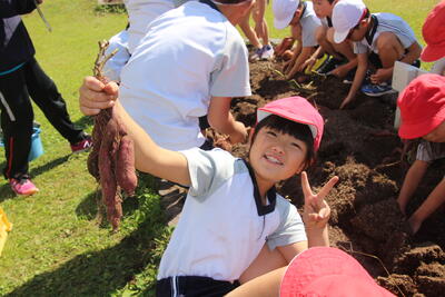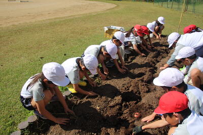1・2年生が教室前の生活科園に植えていたサツマイモが収穫の時を迎えました。稲刈り、脱穀に続き、りんどうヶ丘小学校に実りの秋が到来しています!