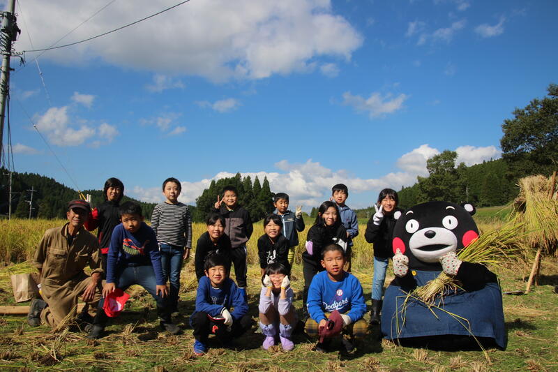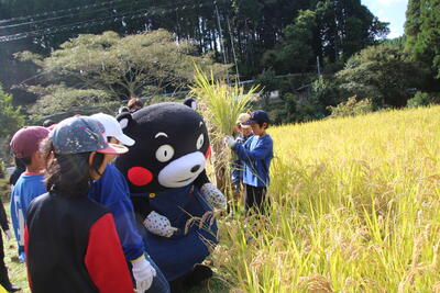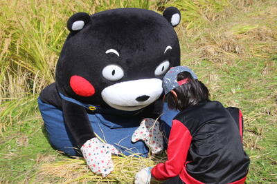 くまモンも稲刈りの先生として参加し、児童は大喜びでした。