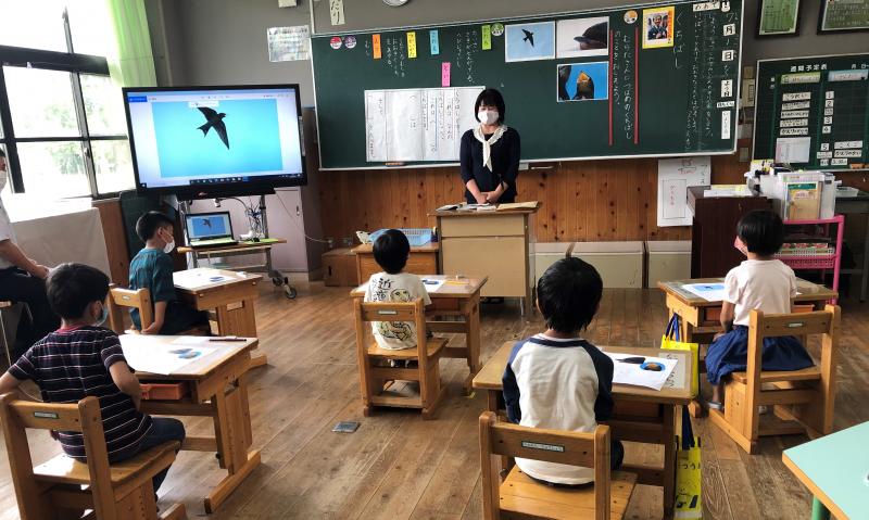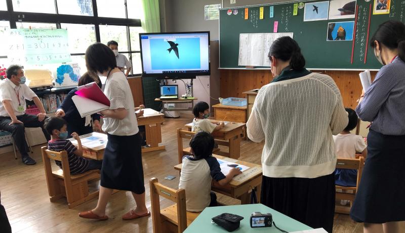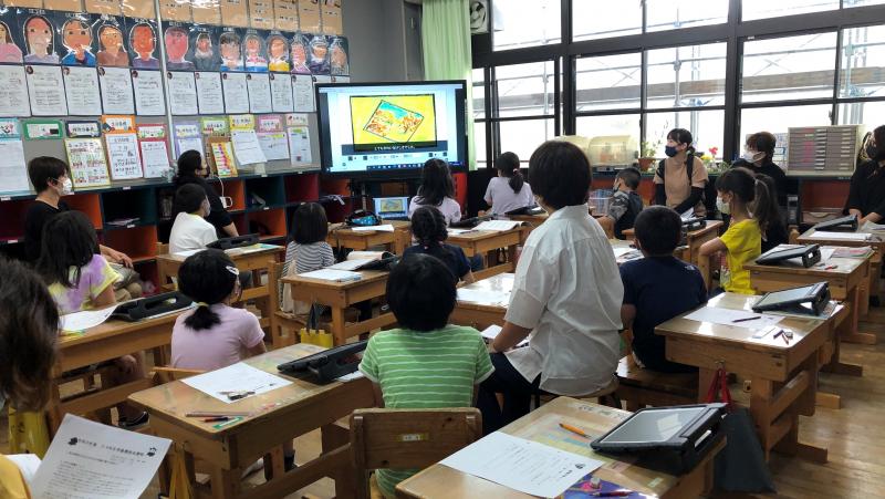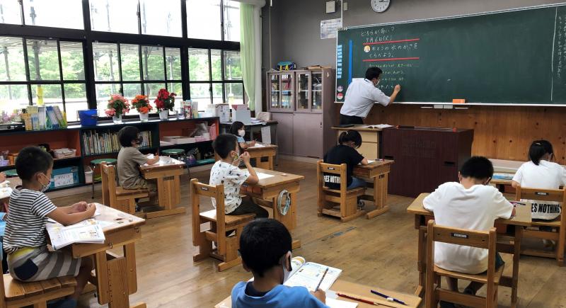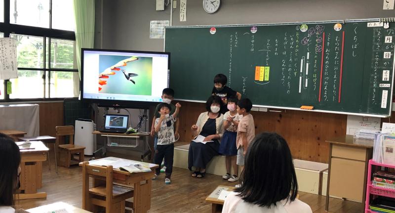 夏休み前の1年生の教室、2年生も一緒に勉強しました。