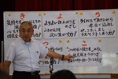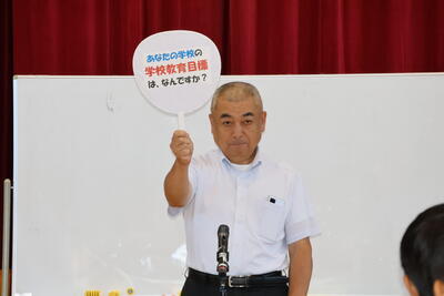 校長先生の話の中で問われた、学校教育目標やスローガン、合い言葉、めざす授業像にみんなで答えました!(事あるごとに繰り返しているので、みんな覚えています。)