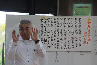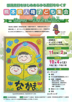先日、全校児童で人権集会を行いました。まずはじめに、校長先生からお話がありました。10月4日(土)に行われた「部落差別をはじめあらゆる差別をなくす 熊本県人権子ども集会」の中で南関第二小学校が発表された「ひとつのことば」(作:北原白秋)について話がありました。