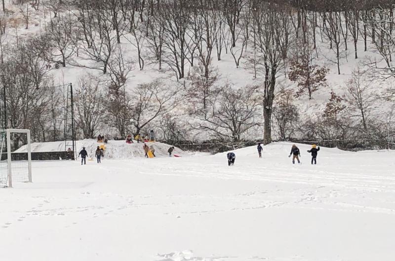 登校するとすぐにソリを引っ張って小山に向かう姿がたくさんありました。