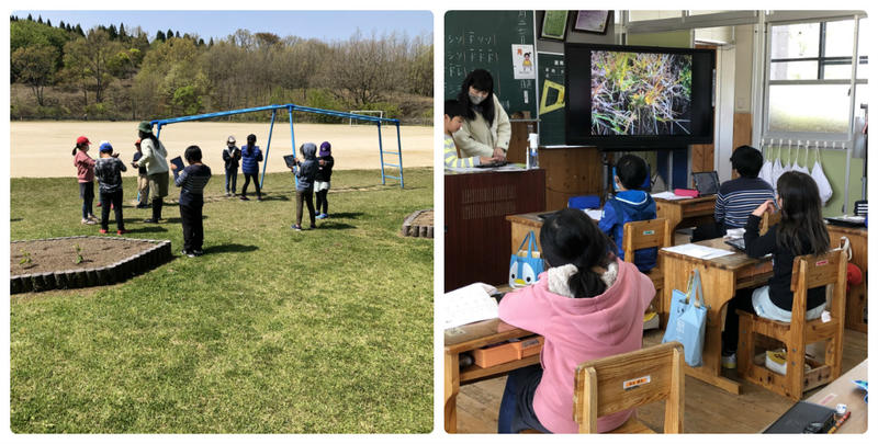 4年生は一人一人がタブレットを持って、広ーい運動場の周りの草原で春の植物を探して写真に収めていました。