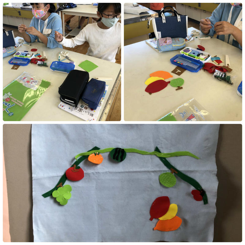 5年生が、家庭科の授業でフェルトを使って裁縫をしています。