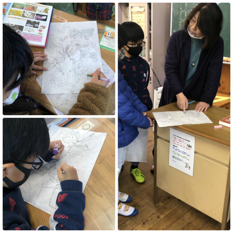 4年生では、版画の先生をゲストにお招きして、版画の下描きをしていました。