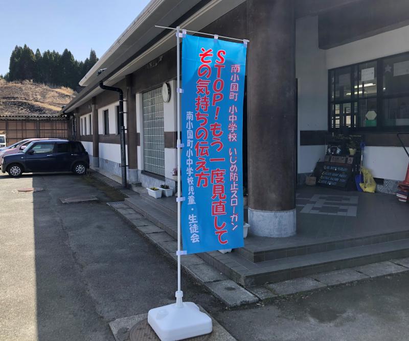 11月に町内の小中学校のリーダー会議が行われましたが、そこでまとめられたいじめ防止スローガンがのぼり旗として完成しました。