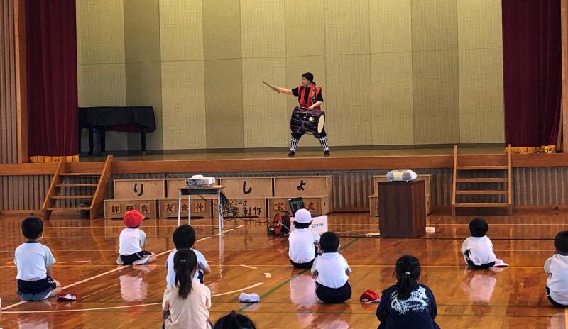 集会の最後に、学生時代太鼓部の職員が、沖縄を歌った歌「島唄」に合わせて、太鼓演奏を披露してくれました(^_^)v