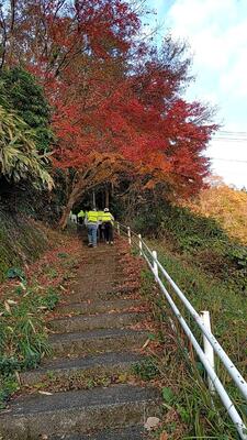 真っ赤に紅葉したもみじのトンネルを通って登校する子供たちです!