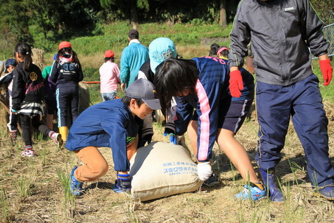 3・4年生が稲刈りをして、かけ干しした田へ行って脱穀しました。