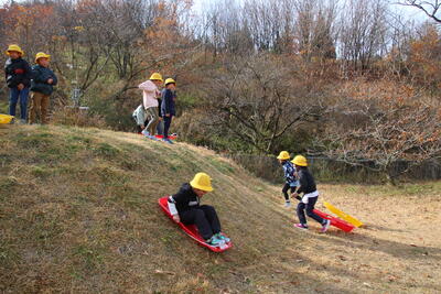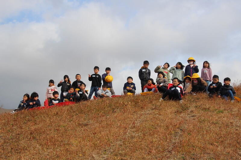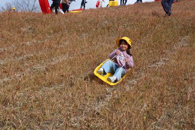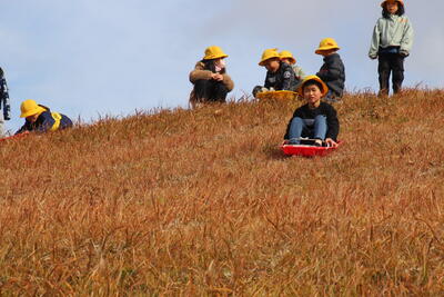 運動場奥の小さい丘やクロスカントリーコースで草滑りを楽しみました!