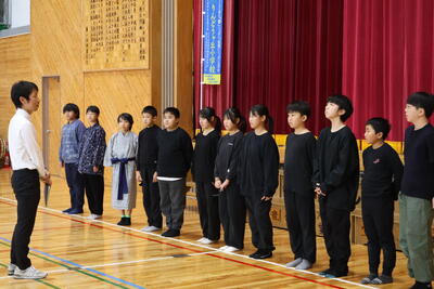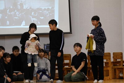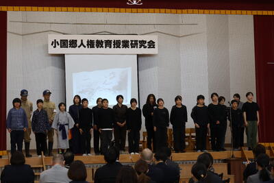 先月26日、小国郷人権教育授業研究会が3会場で行われ、そのうち一つが本校で行われました。本校では、5・6年生が公開授業を行いました。授業では、前半に親子合同劇「青い目の人形」を上演しました。