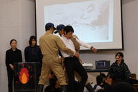 火事の被害の多くは、煙によるものだそうです。実際に煙の中を歩いてみて、視界の狭さや歩き方を学ぶことができました。