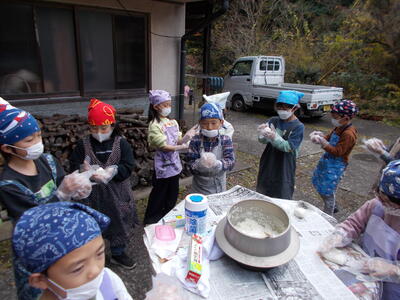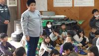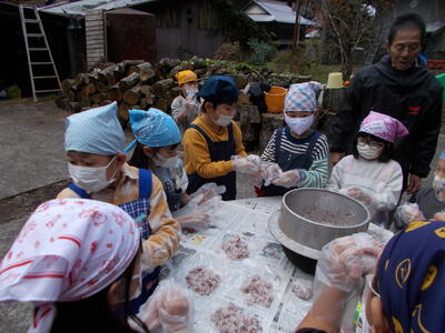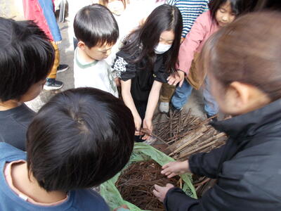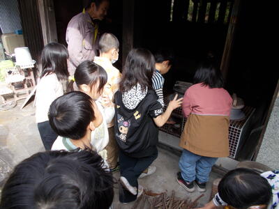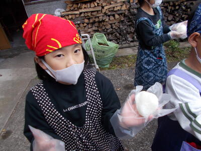 先月27日、1・2年生が地域コーディネーターの北里和教さん宅におじゃまして、かまどでの炊飯とおにぎり作りに挑戦しました!