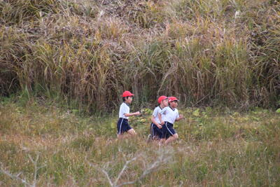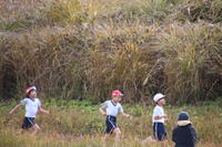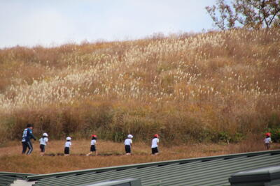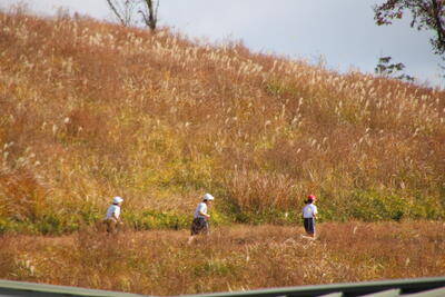 本校の運動場の木々や、校舎横のクロスカントリーコース(上の写真)で秋探しをしました。その後、子供たちが楽しみにしていた・・・草スキー!