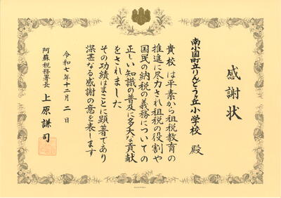例年、本校が取り組んできた租税教育に対して阿蘇税務署様より感謝状をいただきました。