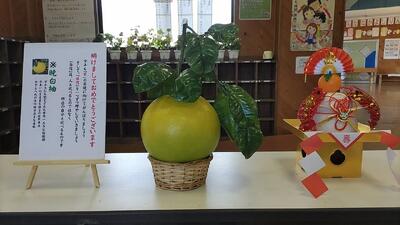 児童玄関です。中央は、世界一大きな柑橘類の晩白柚。(日本一の生産量を誇るのは、熊本県です。)