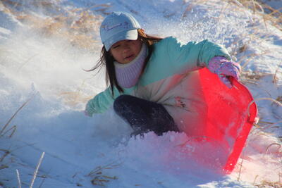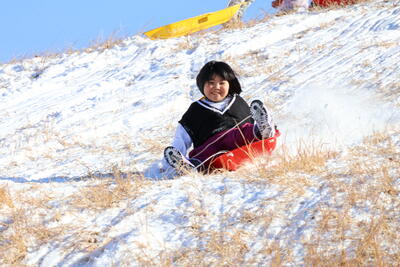 中でも、クロスカントリーコースを使った「そり滑り」が人気です!ただし、初めての子は泣き出してしまうくらいのアトラクション。泣いちゃったかなぁ?と思って見ていると、すぐにまた山に登り出して・・・滑っていました!