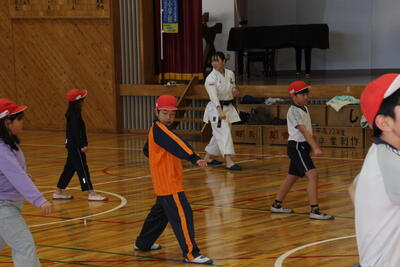 ウォーミングアップが終わると、早速空手の基本の型を教えていただきました。初めて空手を体験する子がほとんどだったのですが、丁寧に教えてもらって少しずつできるようになっていきました。そして、学年ごとに発表しました!