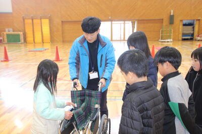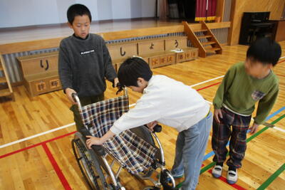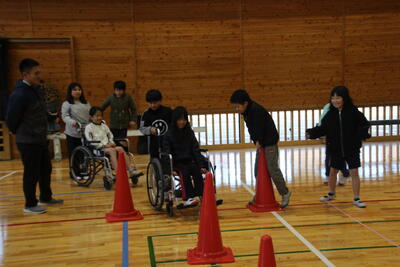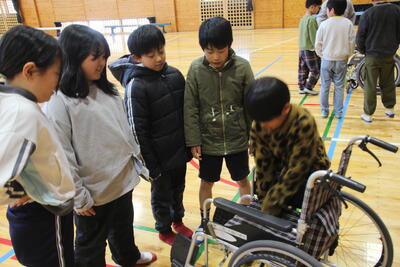 後半は、体育館に移動して車いす体験を行いました。初めて車いすに触れる児童もおり、興味津々でもあり、恐る恐るでもあり、の体験活動となりました。