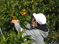 後半は、みかん栽培の仕事についての学習とみかん狩り体験をしました。バスで、水本オレンジガーデンに移動したら、まず昼食をとりました。それから、みかん栽培の様子や工夫について話を聞きました。そして、最後にみかん狩り体験をしました。子どもたちは、ちぎったみかんを食べながらおいしいみかんの木を探し、おみやげのみかんをゲットしていました。