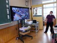 見学旅行の前半は、リモートでの工場見学でした。南関町と和水町に工場のある丸美屋さんからのオンライン学習で、納豆や豆腐の製造について、担当の福永さんが丁寧に分かりやすく説明をしてくださいました。担任の原野も、お借りした作業着を着て、説明に一役買いました。