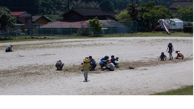 先々週から天気を見ながら草刈りを行っていますが、昼休みになると児童が校庭の草取りに励んでくれます。上級生の子が先に取り組んでいると、後から来た下級生も次々と加わっていきます。サッカーボールをもった子たちも、いつの間にか草取りグループに合流です。ありがたい姿です。耳を澄ますと何やら楽しそうな会話が聞こえてきます。どんなことも楽しんでできる子どもたちです。