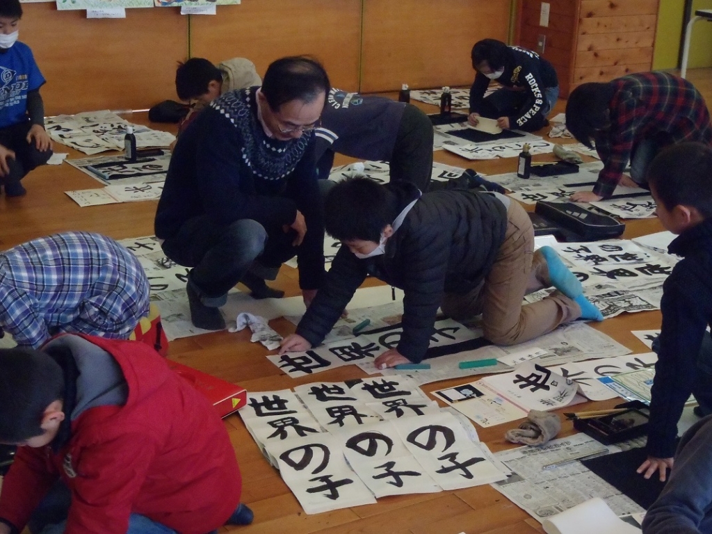 今年は、校区の書道家をお招きして、小型条幅紙に書き初めを行いました。