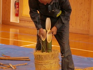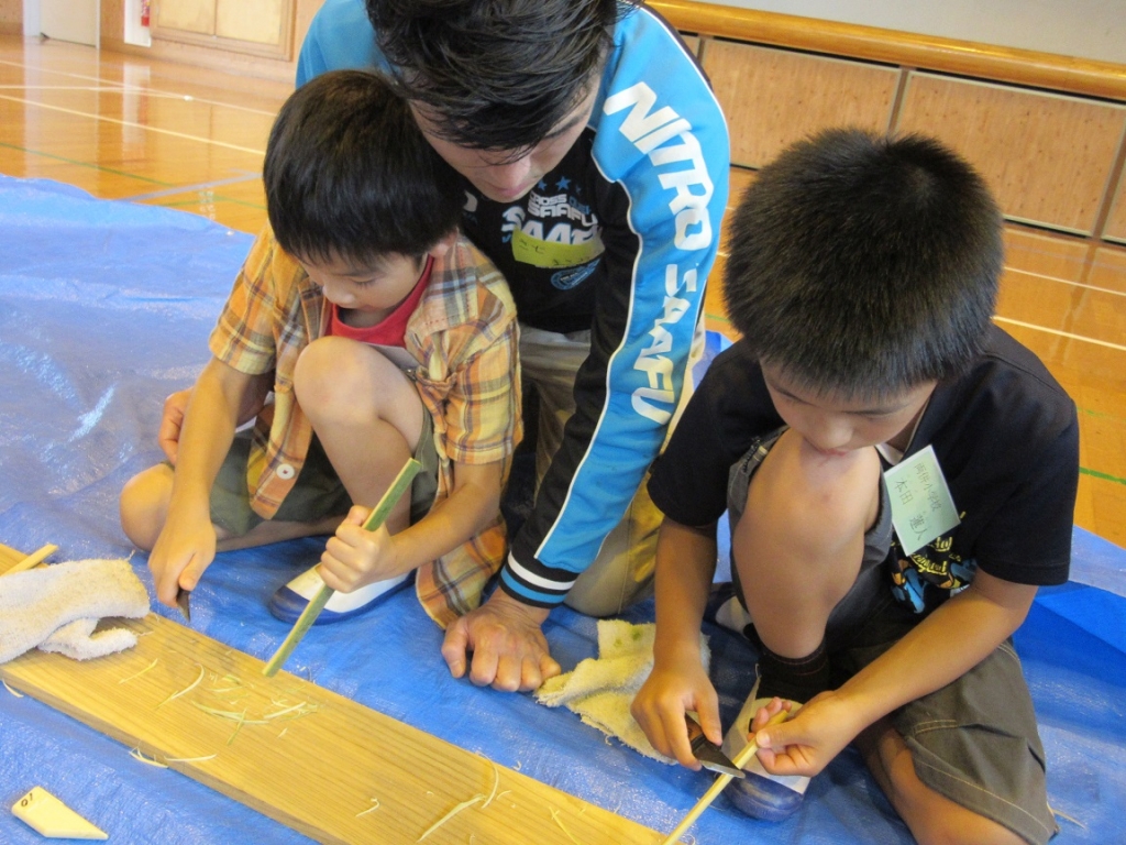 老人会の皆さんにも協力いただき、ものづくりや昔遊びなどを体験しています。今年は、竹箸づくりを行い、自分の作った竹箸で、豆つかみ大会を行いました。