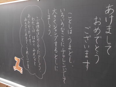 さて、今日から3学期が始まりました。子供たちが気持ちよく、やる気が高まるように、先生方が、教室黒板の言葉、玄関前の掃除等々、迎える準備を整えてくださっており、おかげさまで、子供たちの元気と笑顔が溢れるスタートとなりました。あるクラスでは、「チャレンジするときっと、ウマくいく。たくさんの笑顔がウマれる一年になりますように」と、午年にちなんだ言葉もありました(初任の先生クラス)。※ドラえもんの絵もお見事。やっぱり、学校って、子供たちって、いいですね。私たちが元気をもらいます。そんな一日となりました。