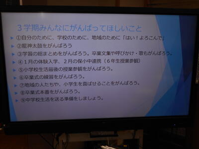 3学期がスタートし、1週間ほどが過ぎました。16日の児童集会では、各クラスの代表が3学期や新年の目標を発表しました。学習、生活、家庭や地域などについて整理ながら落ち着いて発表する姿から、3学期への意欲を感じました。発表する話の構成を工夫したりするなど表現力の向上も感じられました。また、3学期に力を入れて取り組むあいさつを子どもたちの力で活発にするために、「あいさつドラゴンズ」を結成することが報告されました。3学期は短い学期ですが、現学年のまとめや次の学年への準備などいろいろなことにをがんばっていきたいと思います。