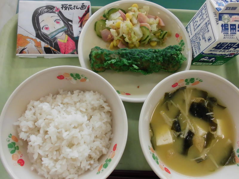 今日の給食は、麦ご飯、禰豆子(ねずこ)の竹ちくわ、ピーナッツ和え、みそ汁でした。禰豆子とは、今、子どもたちに大人気のアニメ「鬼滅の刃」のヒロインです。(左上に6年の桜花さんが描いてくれたイラストをご参照ください。鬼にされてしまったので、いつも竹製の口かせをかんでいます。)禰豆子のかんでいる竹をイメージして、竹輪の磯辺揚げの衣に食用色素の緑粉を入れてみました。