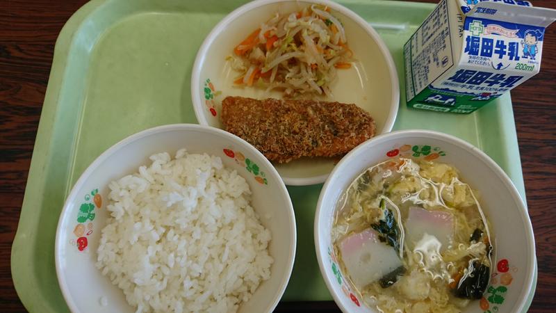 今日の献立は、ごはん、平鯛(へだい)のフライ、もやしのくるみあえ、かき玉汁でした。