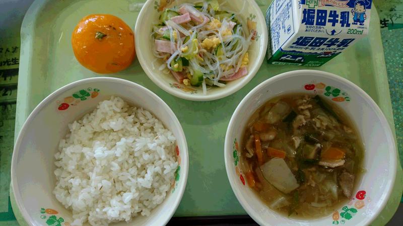 今日の献立は、中華丼、バンサンスー、冷凍みかんでした。