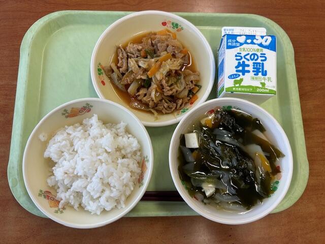 初日の給食は、麦ごはん、牛乳、豚肉の生姜焼き、わかめスープ、でこぽんでした。