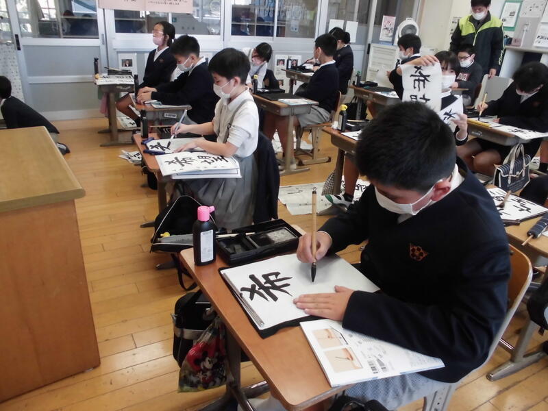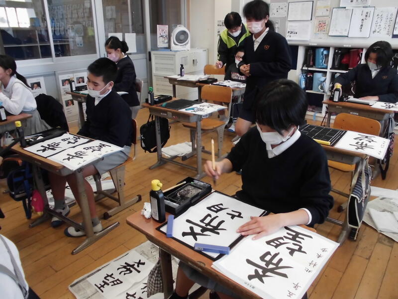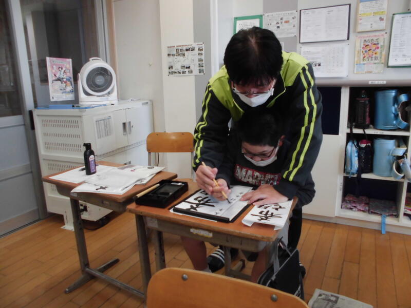 3年生の毛筆の時間です。字も上手になったけど、だいぶ手や顔が墨で汚れなくなりました。