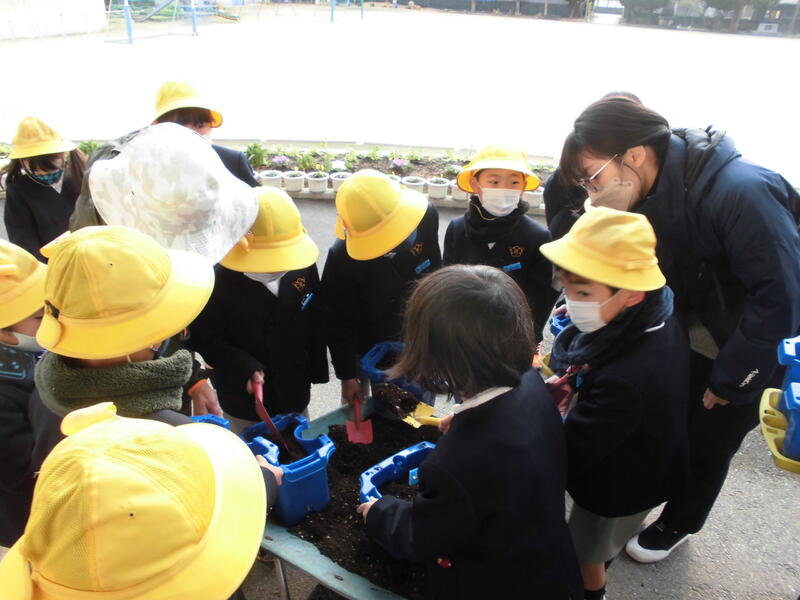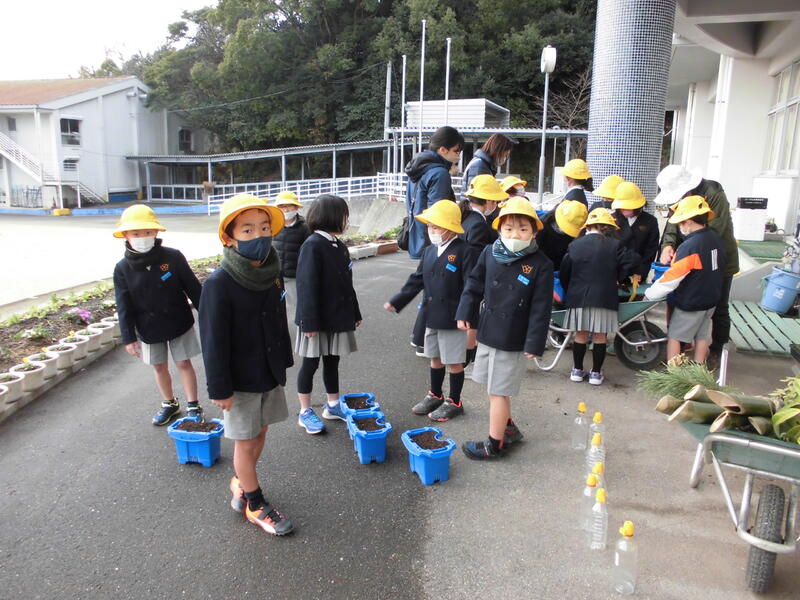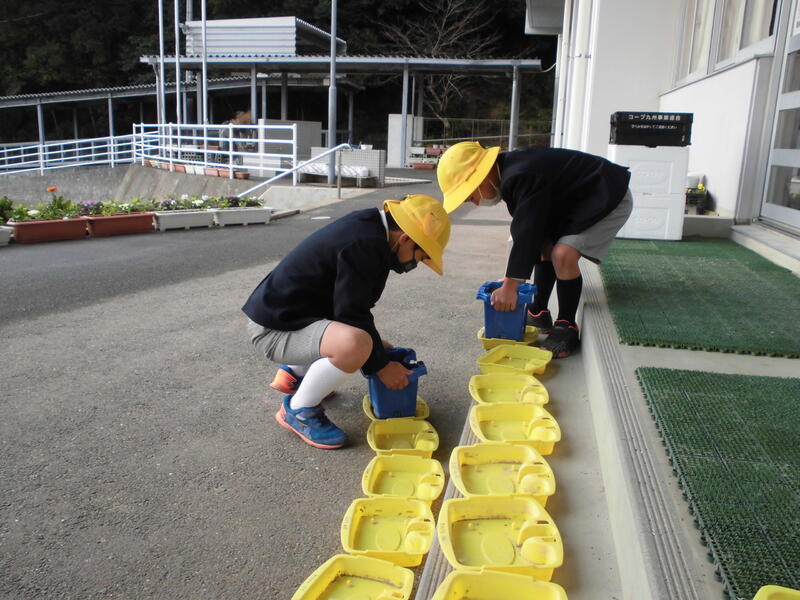 川本先生から種まきの仕方の説明を聞き、土入れから行いました。そして、パンジー、ナデシコ、デイジー等の種をまきました。5,6年生が下級生に声をかけながら進めることができました。