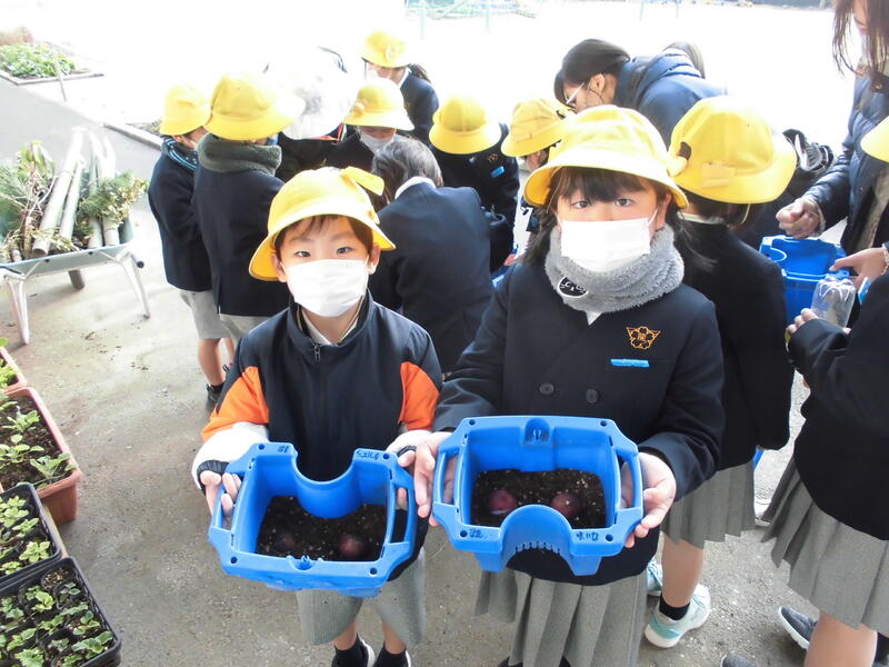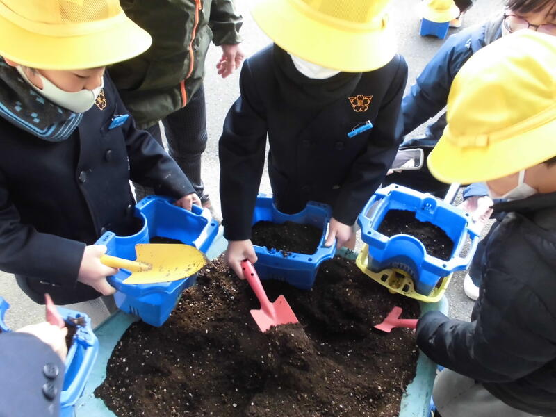 4年生は、民生児童委員協議会と更生保護女性会の皆様とチューリップの球根植えをしました。