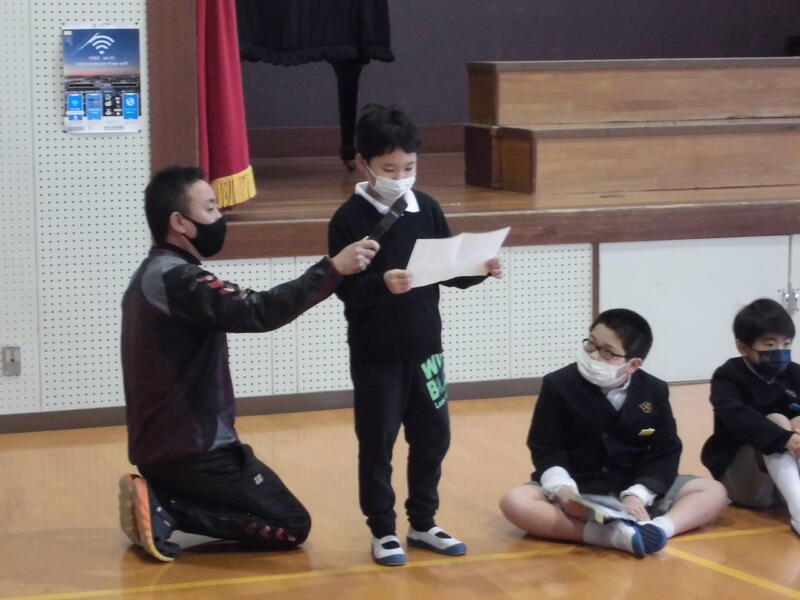感想発表です。全校児童の前で手を挙げて発表するのってすごいですね。