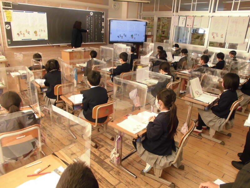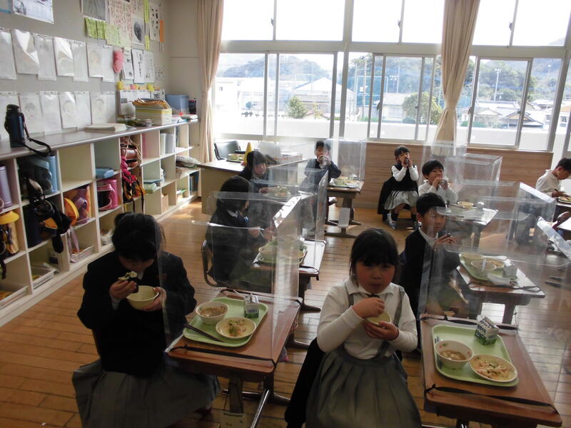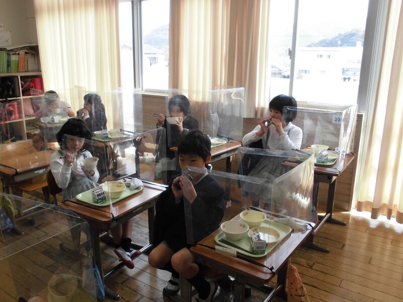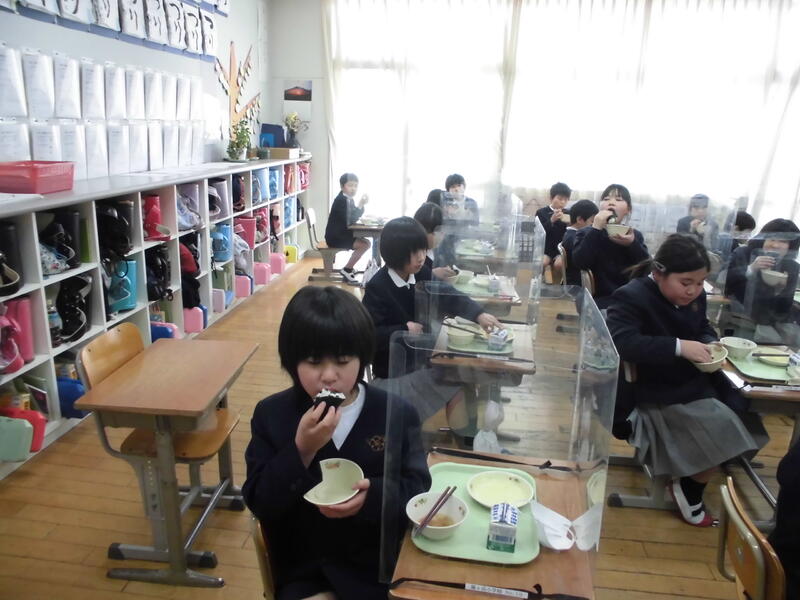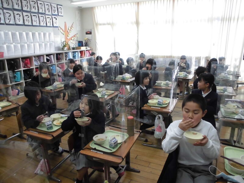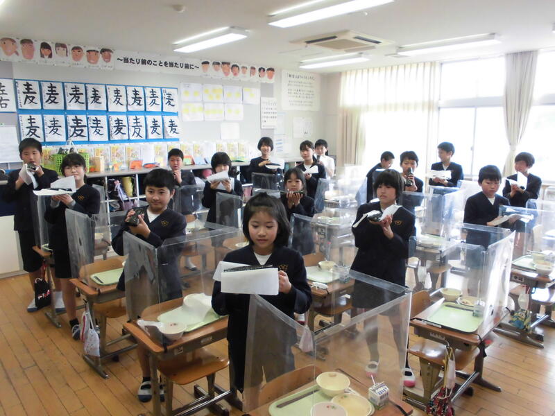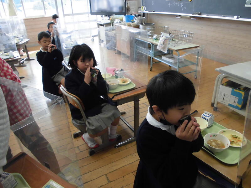 今日の出来事でもう一つ、給食の時間を紹介します。今日のメニューは「お祭り風給食」ということで、焼きそば、たこやき、プチドッグ等が出ました。少しでもお祭りの気分を味わってもらおうと、1年生は、はっぴを着て給食を食べました。(栄養教諭の田﨑先生が準備してくださいました。)笑顔いっぱいで焼きそばをもりもり食べていました。