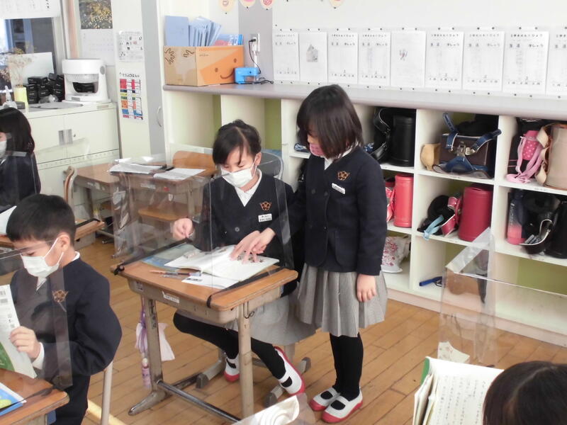 腰を曲げたり、ひざをついたりして1年生の目線で話すことができる6年生。「すばらしい!」のひと言です。6年生の1年生に対する優しさが、伝わってきます。