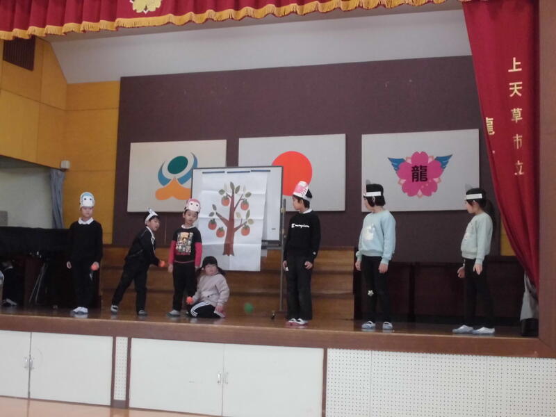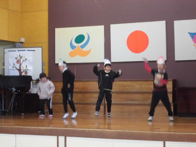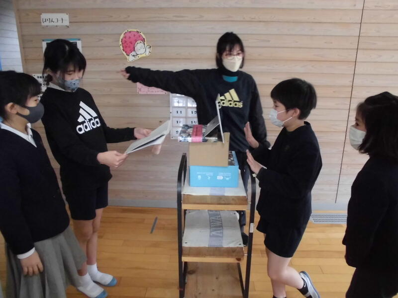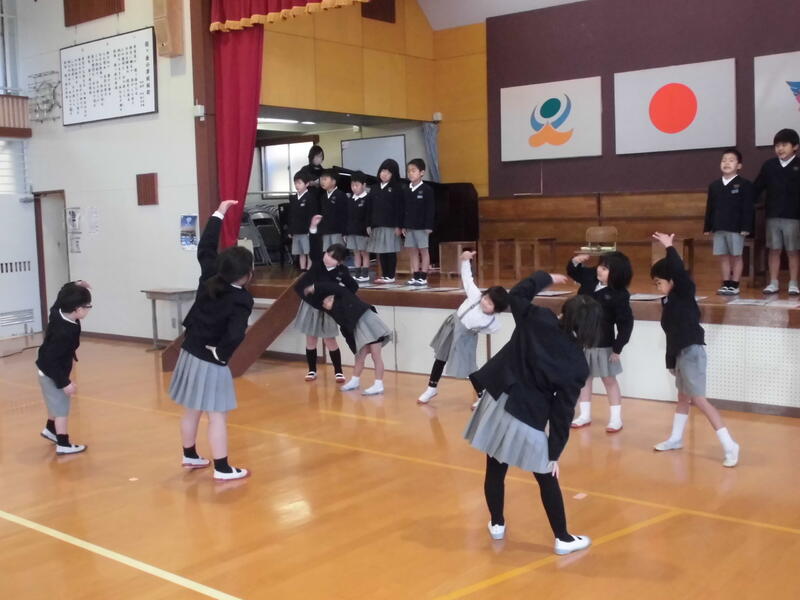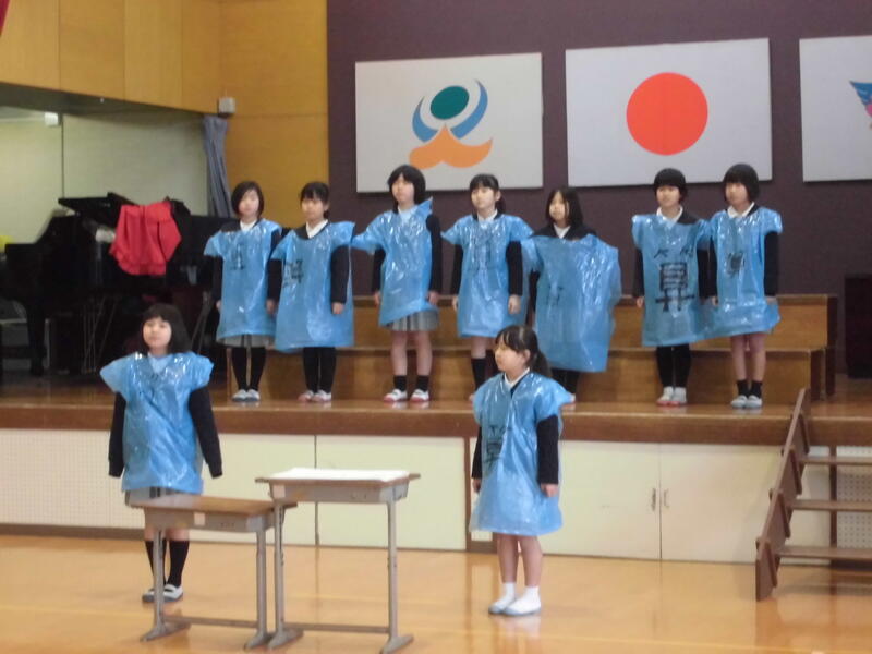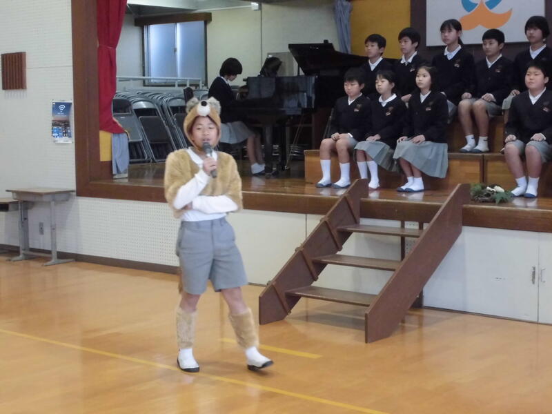 体育委員会のみなさんが、楽しい劇をまじえて「体を柔らかくするためにストレッチをしましょう。」とよびかけてくれました。