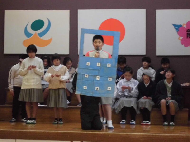 今日は児童集会がありました。今回の担当は体育委員会です。龍ヶ岳小の体力の課題は・・・「柔軟性」