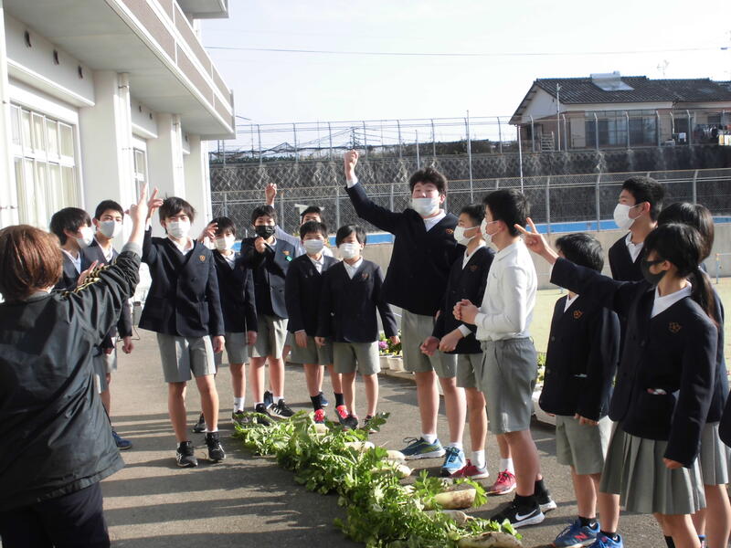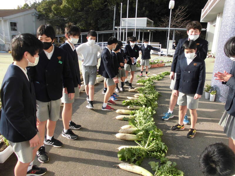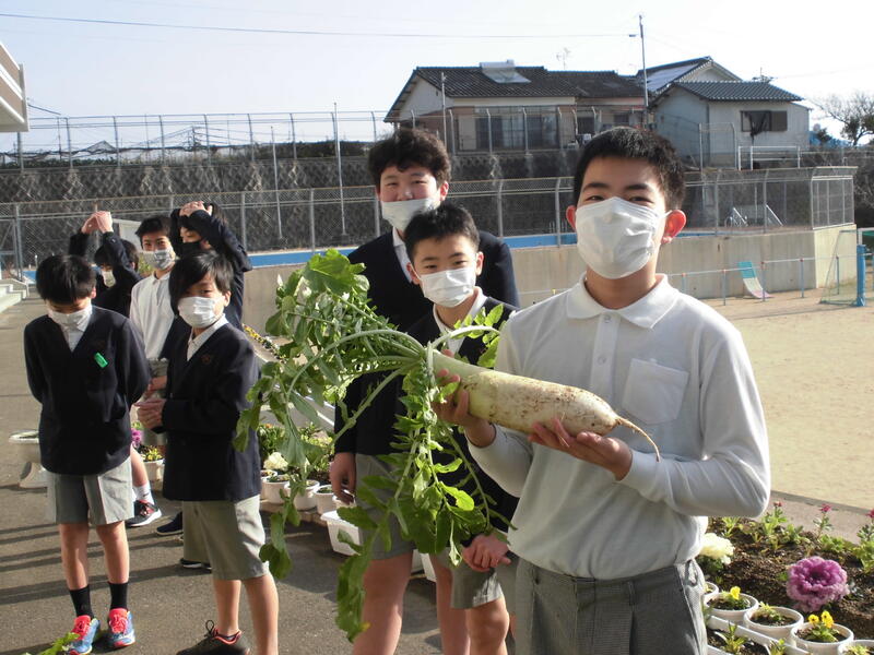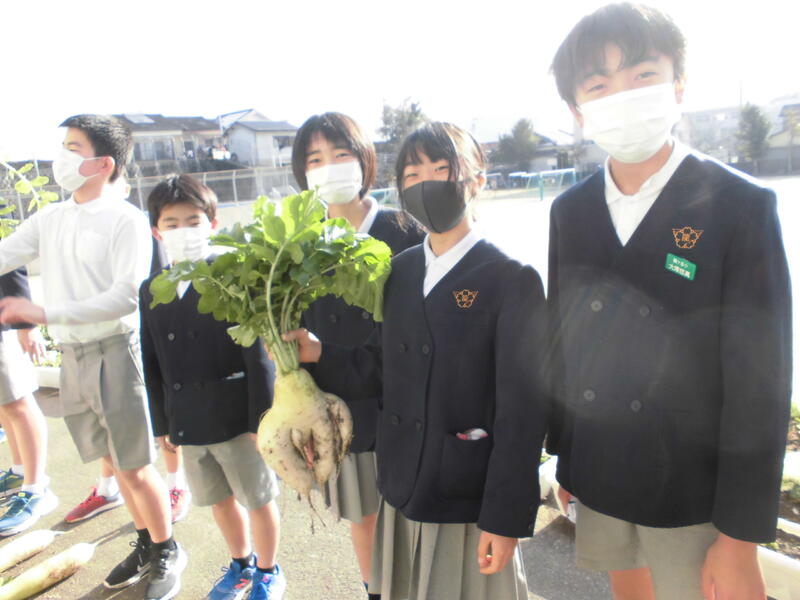 4年生が大根を収穫しました。「大きいですね~」明日はおでんパーティーだそうです。