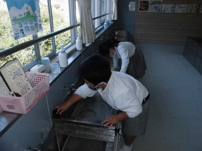 6年生家庭科の洗濯実習です。手袋とはちまきを洗いました。